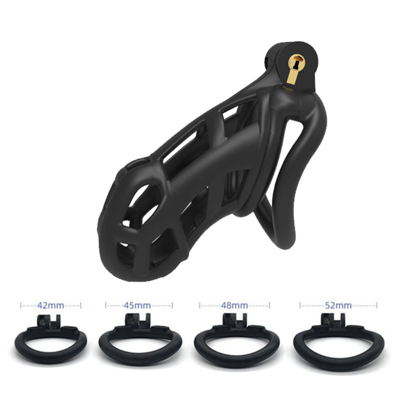 This male chastity cage is designed for comfortable, all-day wear with its breathable and lockable design. Made from hypoallergenic medical-grade polycarbonate, it is extremely durable and has a smooth, non-porous surface. The set comes with everything you need for a tailored fit, including 1 cage, 4 rings of different sizes (42mm, 45mm, 48mm, and 52mm), and 1 built-in lock.