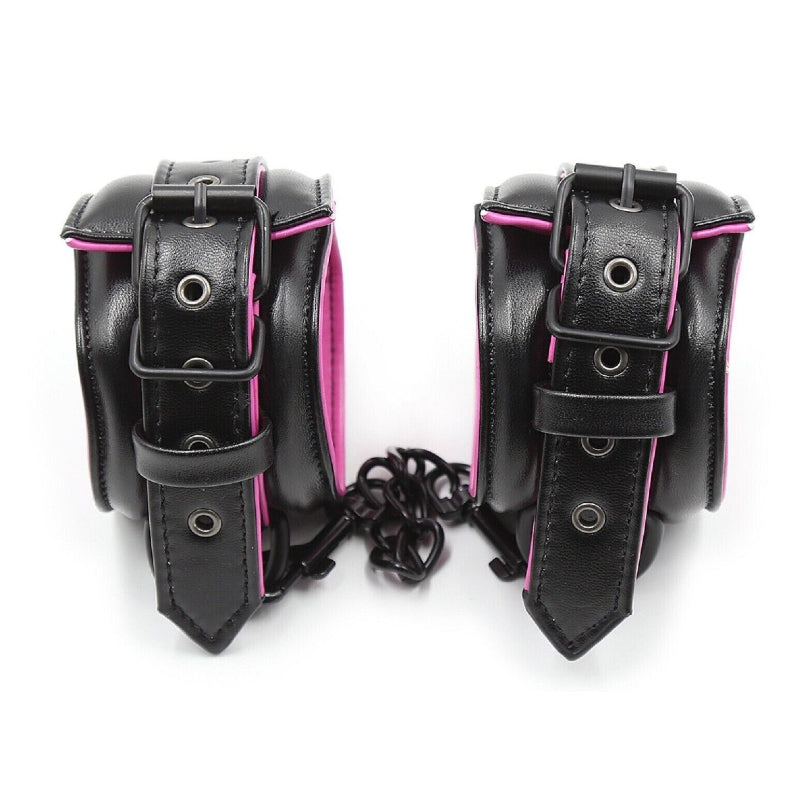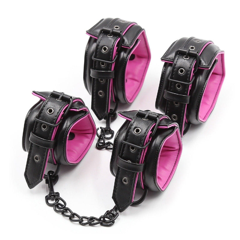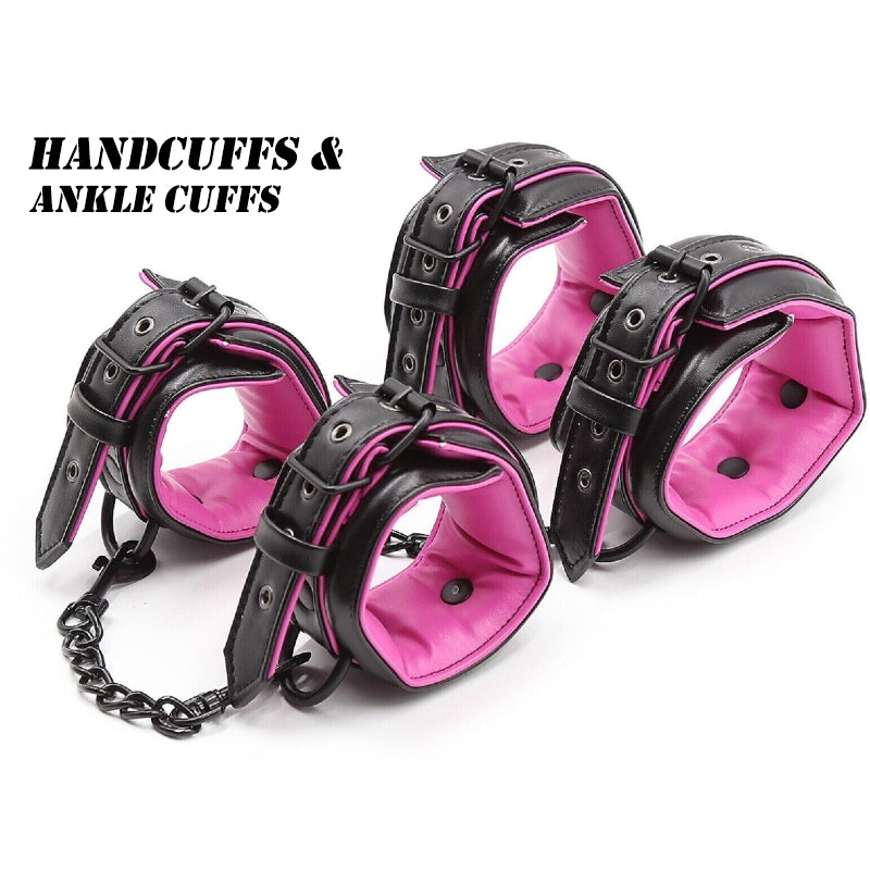 Delve into the exciting world of BDSM with Premium Thick Flax Faux leather padded bondage collection. Available combinations are collar and leash, handcuffs, and ankle cuffs or choose the full set for a more exciting game!