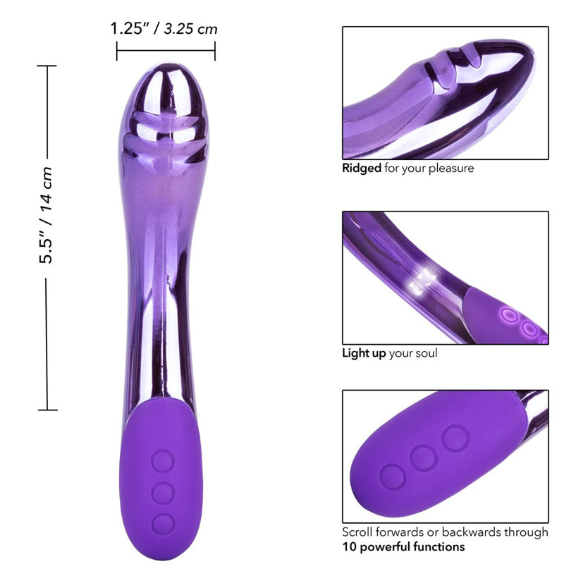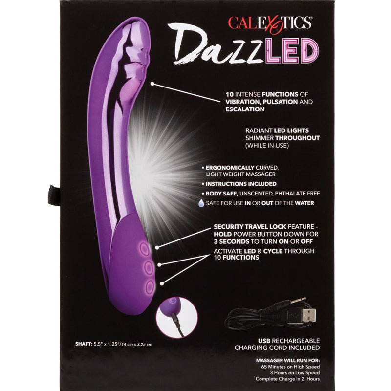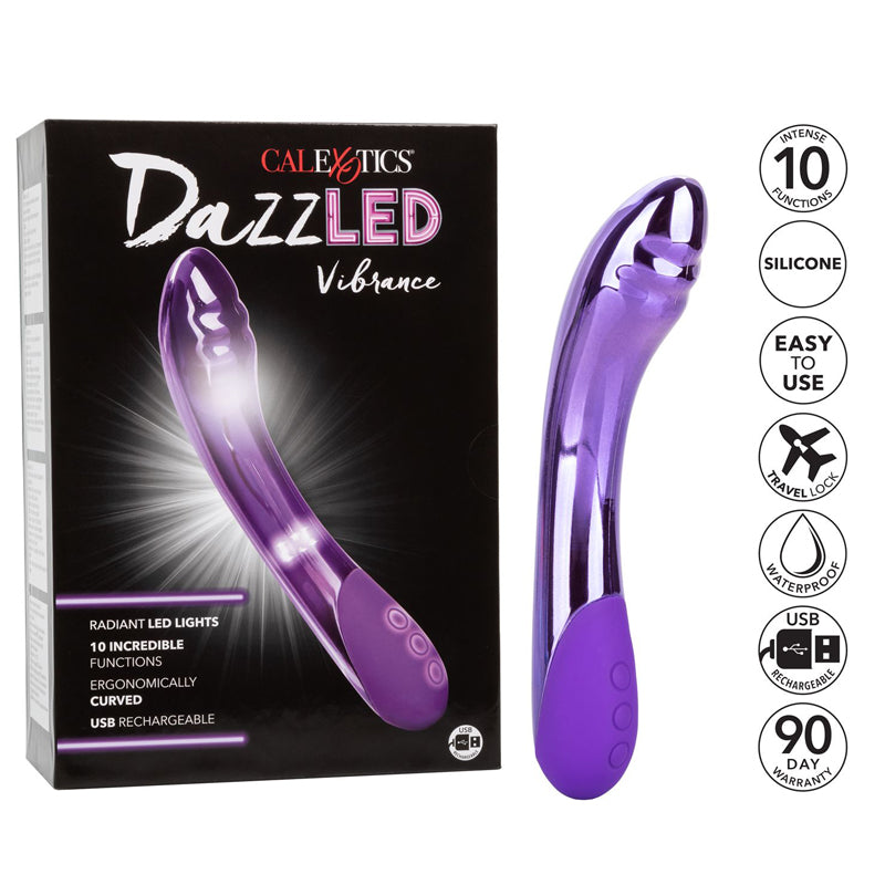 CalExotics DazzLED Vibrance packs intense 10-function vibrations into a bold wand with pulsing LED lights. The beautifully designed massager has a sensually contoured shaft, ridged tip and 10 playful vibration functions for a knee-shaking pleasure experience. This delightful Wand is a daring option for beginners and perfectly thrilling for erotic experts. Whatever you’re hoping to indulge in sensual solo time or play up with a partner, this dazzling vibrator wand is ready to thrill. Radiant LED Lights down the shaft of the vibe make play time effortless, even on the darkest nights. The contoured body and teasing tip is sure to always rub you just the right way, while 10 functions of vibration send you spiraling into a wonderland of pleasure. The self-sealing charging port on the base of the massager lets you charge up your passion in 2 hours and embrace up to 2 hours of vibrating pleasure. To maximize and customize your pleasure, the easy-touch button control pad lets you control the independent motors and a security travel lock feature to take your pleasure to-go.